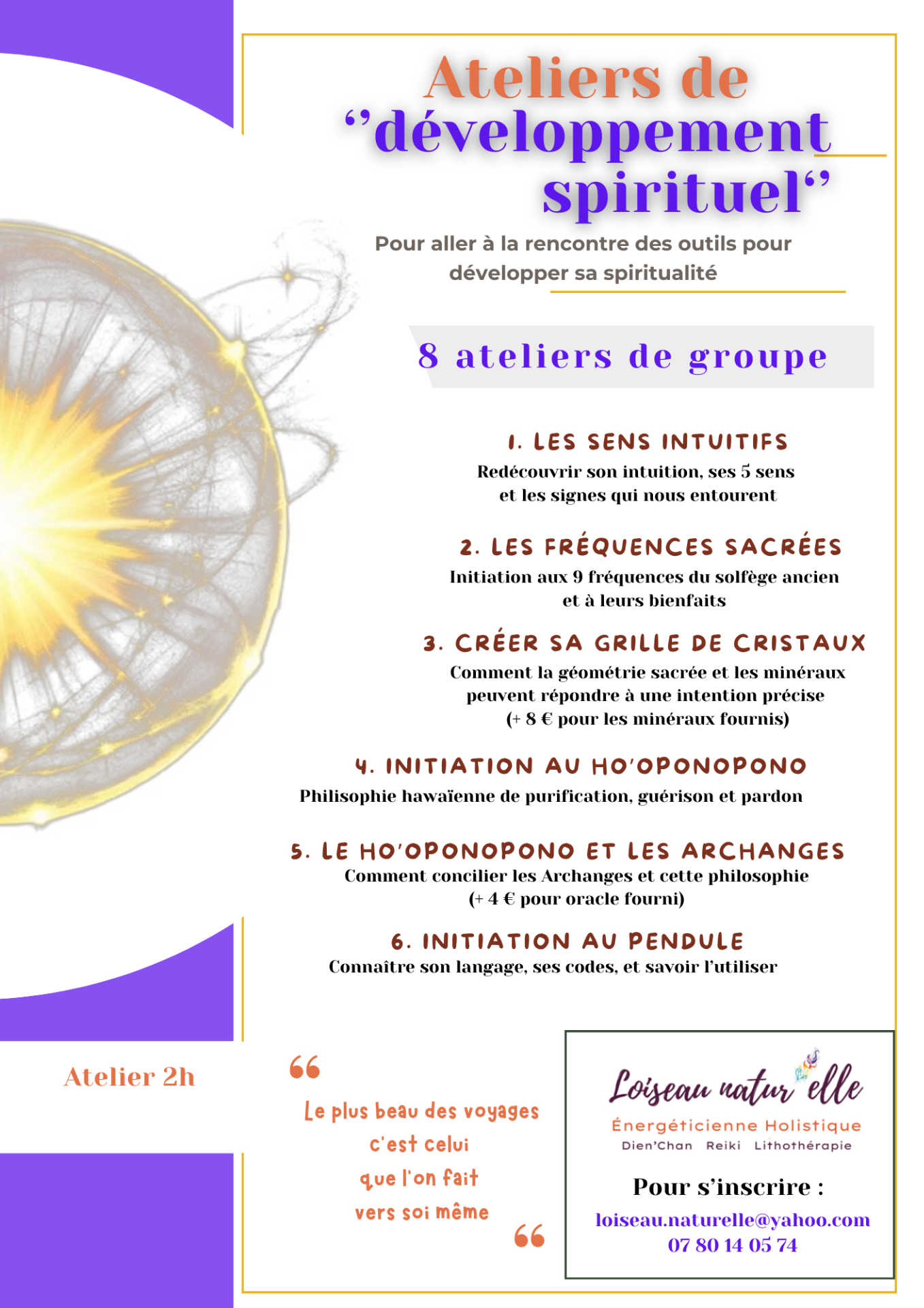Je vous propose un parcours en 8 ateliers pour explorer votre monde intérieur, développer vos capacités intuitives et intégrer des outils simples et puissants dans votre quotidien.