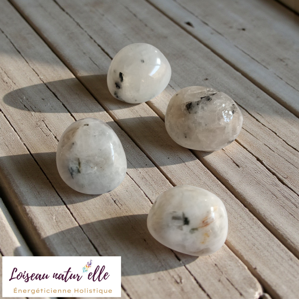 La Pierre de lune blanche et noire accompagnerait l'intuition et les cycles émotionnels.